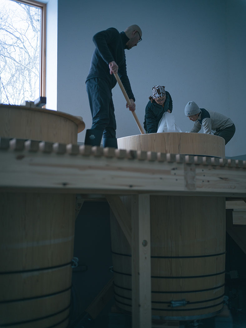 「まっさらなところから構想していきます。自分の生活の中に感じられるものを抽出して、どういう色味のイメージか、それは直線なのか曲線なのかを探っていく」醸造家・北原亮庫の酒造り。それは風景と向き合い、白い紙に線や色を描き出すように始まる。酸味や苦味は直線的、旨みは丸く曲線的――。そうした味覚に直結する感覚だけでなく、風に揺れる緑の深さや、雪に光が反射して輝く情景を、どう酒に落とし込むかを思い描いていく。