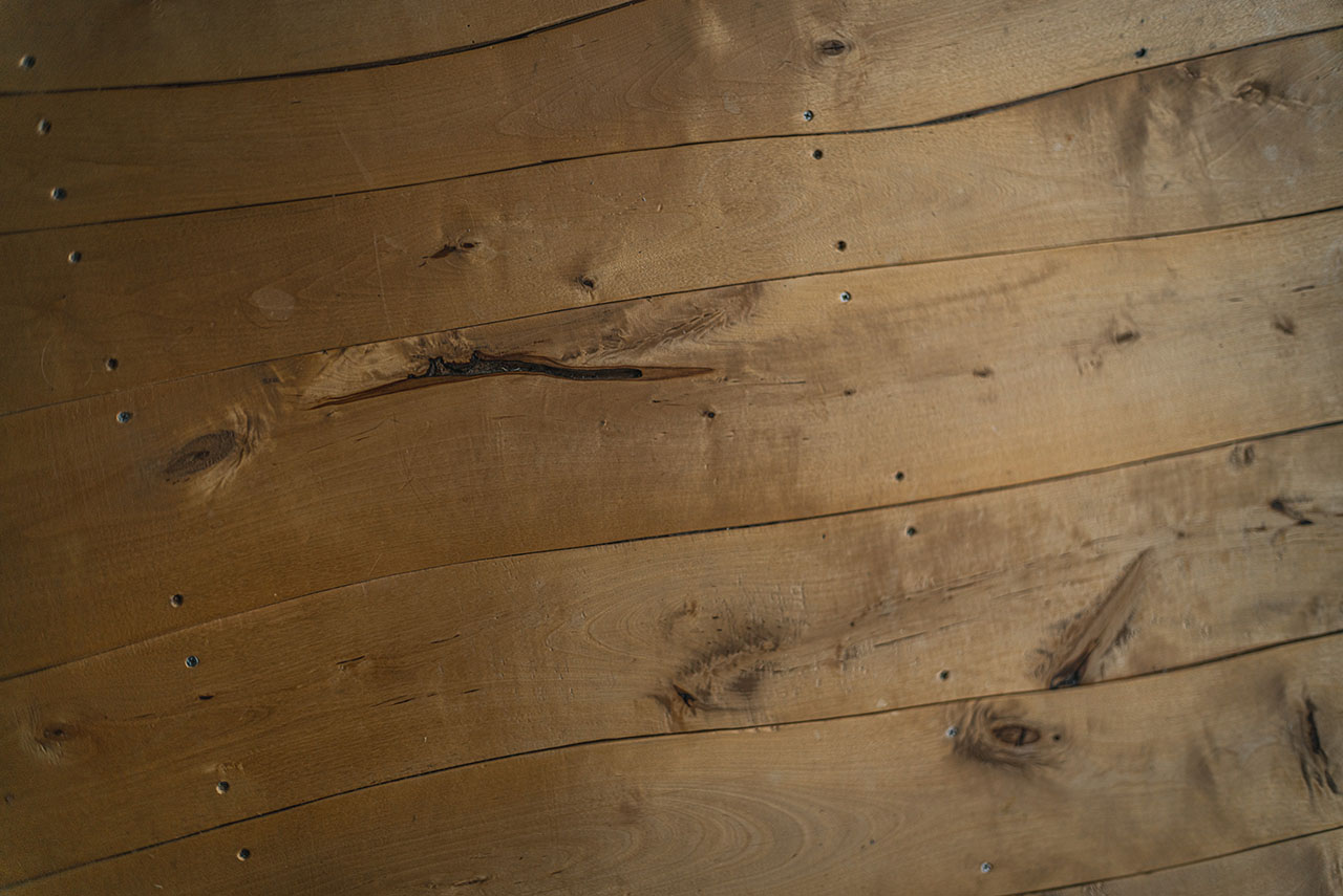 — 陣内 木こりが建築現場にジョインして、評価していただけるという、本当に貴重な機会となりました。まるで森の中にポンッと醸造場を置いたように見えたら最高だと思いました。道路の近くにあった木をすべて切らず、太く成長した木を残し、建物の角度を少し振ることを提案しました。伐採した木の多くは、成長の早いシラカバやドロノキ。虫に喰われて中が腐り寿命を迎えつつある木もありました。これらは製材して内装や家具、カトラリーや薪に生かしています。造成も手がけることになり、木こり仲間に声をかけられるだけかけて取り組みました。通常は表土を剥ぎ取り芝生をふきつけますが、それでは表土を捨てることになります。そこで表土に付着していた笹や切り株を、植栽の代わりに造成地へ移植しました。そこにあるものを何も捨てず、何も持ち込まない造成を目指しました。